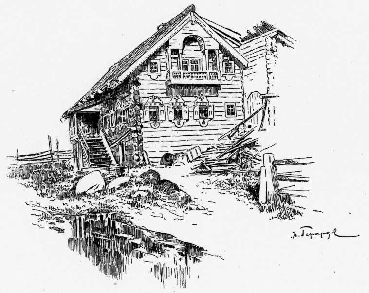 Деревушка Пулозеро очень маленькая: нѣсколько маленькихъ избъ, нѣсколько избъ заколоченныхъ, очевидно, покинутыхъ хозяевами, не выдержавшими условій жизни въ этой залѣсной заглушной сторонушкѣ. Изъ темныхъ домиковъ особнякомъ выдвигается большой красивый двухэтажный „тысячный” домъ Мухи.