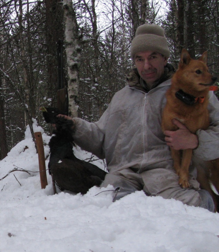 Как же, птица почему-то не падает, и не улетает, а хозяин, вместо того чтобы дострелить, какую-то жердь рубит! Но, так или иначе, мы его добыли. Такой вот, трудовой глухарь - первый трофей Умы, добытый по снегу.