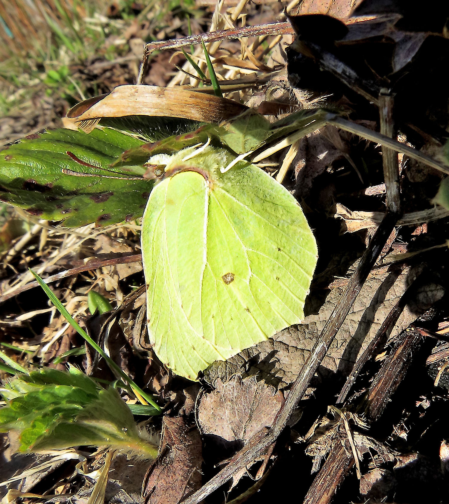 Было холодно и солнышко временами после дождя, бедные бабочки под листы спрятались. Вот крушинницу-самца поймал. Снимал практически в упор, поскольку насекомое признаков жизни не подавало