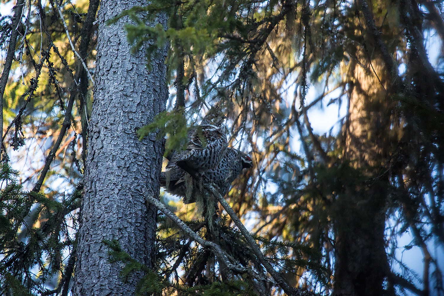 Фотография не очень четкая, но зато показательная. На примере рябчиков. Это классическое положение для боровой дичи при изучении окрестностей и высматривании опасностей. Самочка сидит выше самца. Обычно именно она и дает сигнал "бежать", если рядом есть самец. А вот если самца рядом нет, то она может быть очень наивной - и подпустить опасность гораздо ближе, чем надо. Вот такая социальная забота - боровые девчата оберегают парней, а себя жалеют меньше.