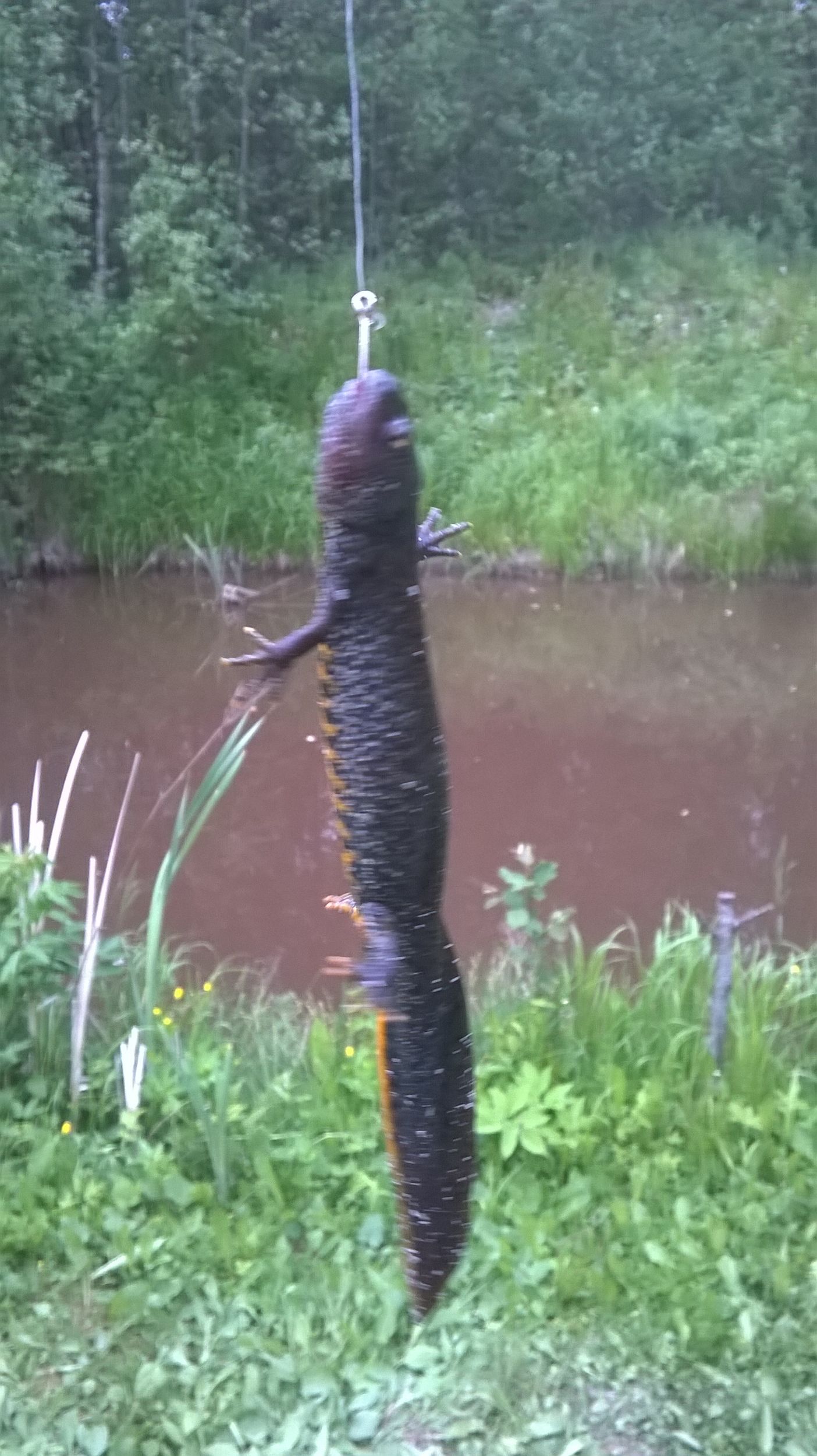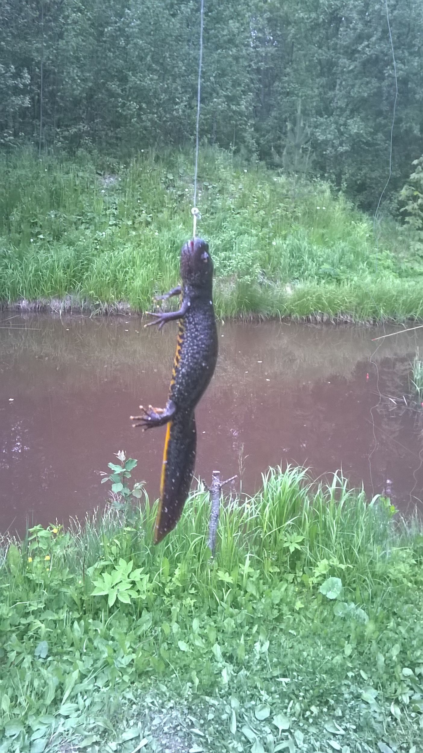 На выходных был с семьёй на даче. На участке в пруду с сыном ловили карасей. Караси маленькие, но для азарта (поймал-отпустил) пойдёт. И вот выловили такую штуку. :ne_vi_del: