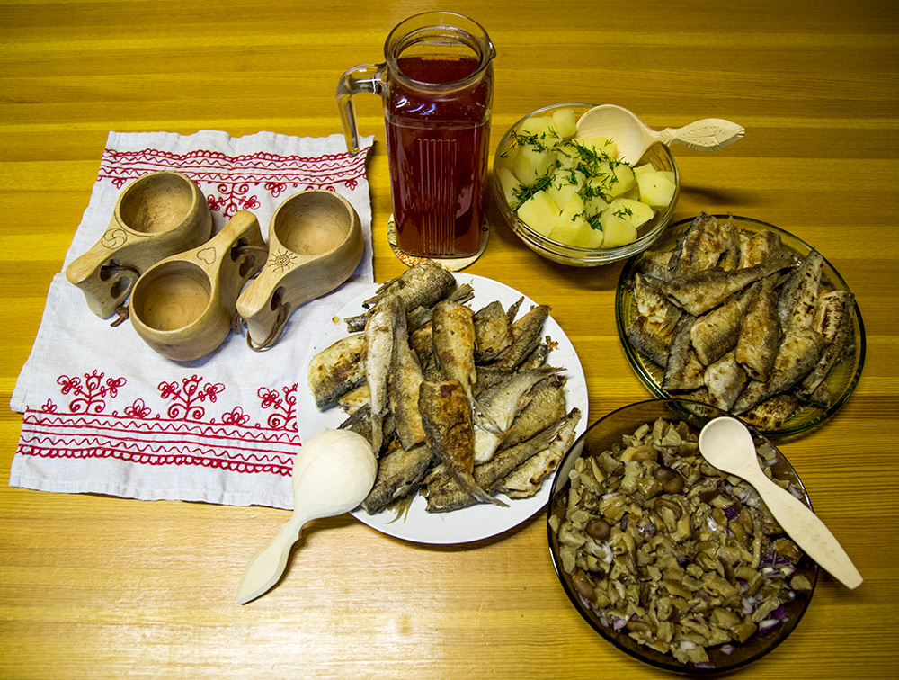 5) Все приготовить в соответствии с традициями и навыками. Все просто: отварная картошка, соленые грибочки, жаренная плотва, морс брусничный.