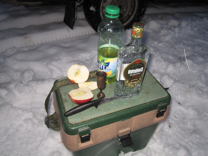 Еще не до конца рассвело, разбираем с машины шмотки, наливаем по пять капель :)><(: за предстоящую рыбалку,