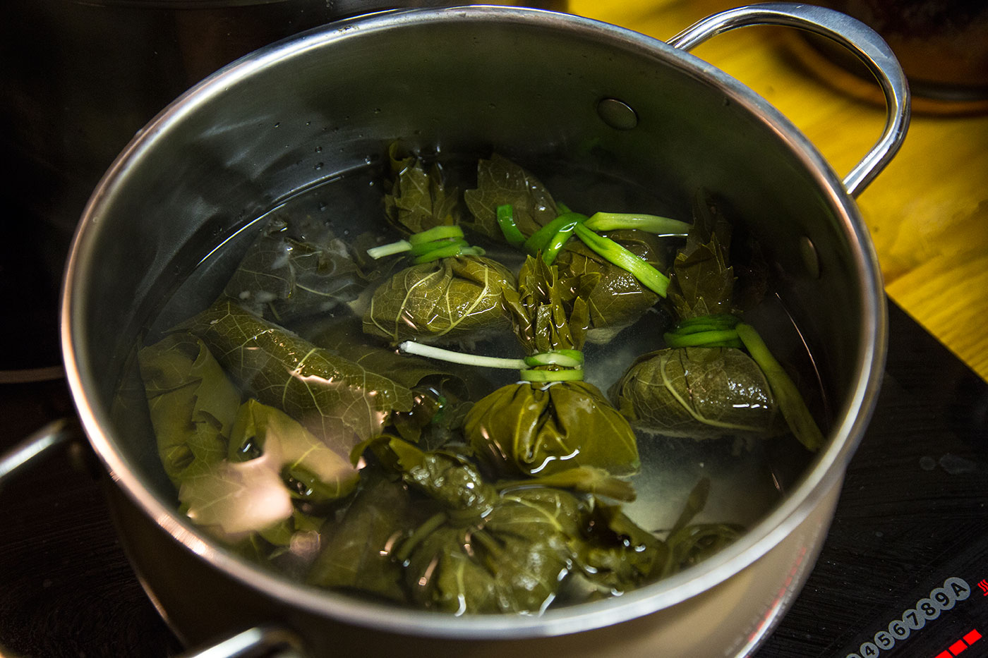 PS: Полный цикл готовки при наличии ингредиентов занимает около 1 часа. Если голод очень сильный - то можно сократить время на 20-30 минут и варить охотничью долму без заморозки. Но здесь есть риск, что листья и завязки могут раскрыться во время варки.