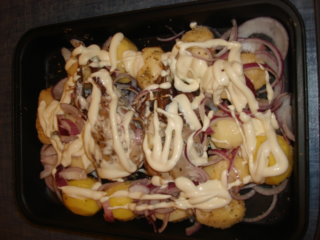 Участвуют: рябцы-2 шт, немного картохи, лучок, брусничка, жирок, сырок, манонез(ну кудаж без него новый год же) солик и приправки.Рябцов я напихал брусничкой, свинячим жирком внутрь мяска, обложил картохой, засыпал луком,обсыпал сыриком, обмазал манонезиком да в печурку. По мне так получилось нормуль, скво сказала ну ниче, но чето особых отличий от цыпляток не почуяла (она вообще грынпиисс).Наверно ананасов нехватило.