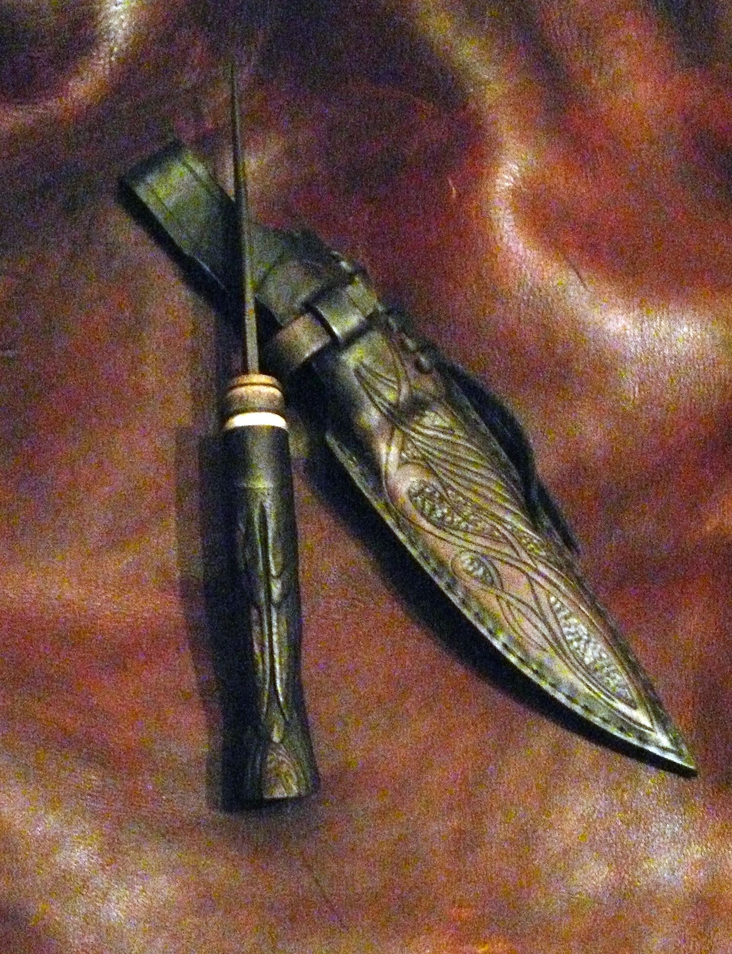 Ножны дуб (броширование)кожа хромового дубления отделка типографская краска(использовал для дерева) Восковая мастика масло.