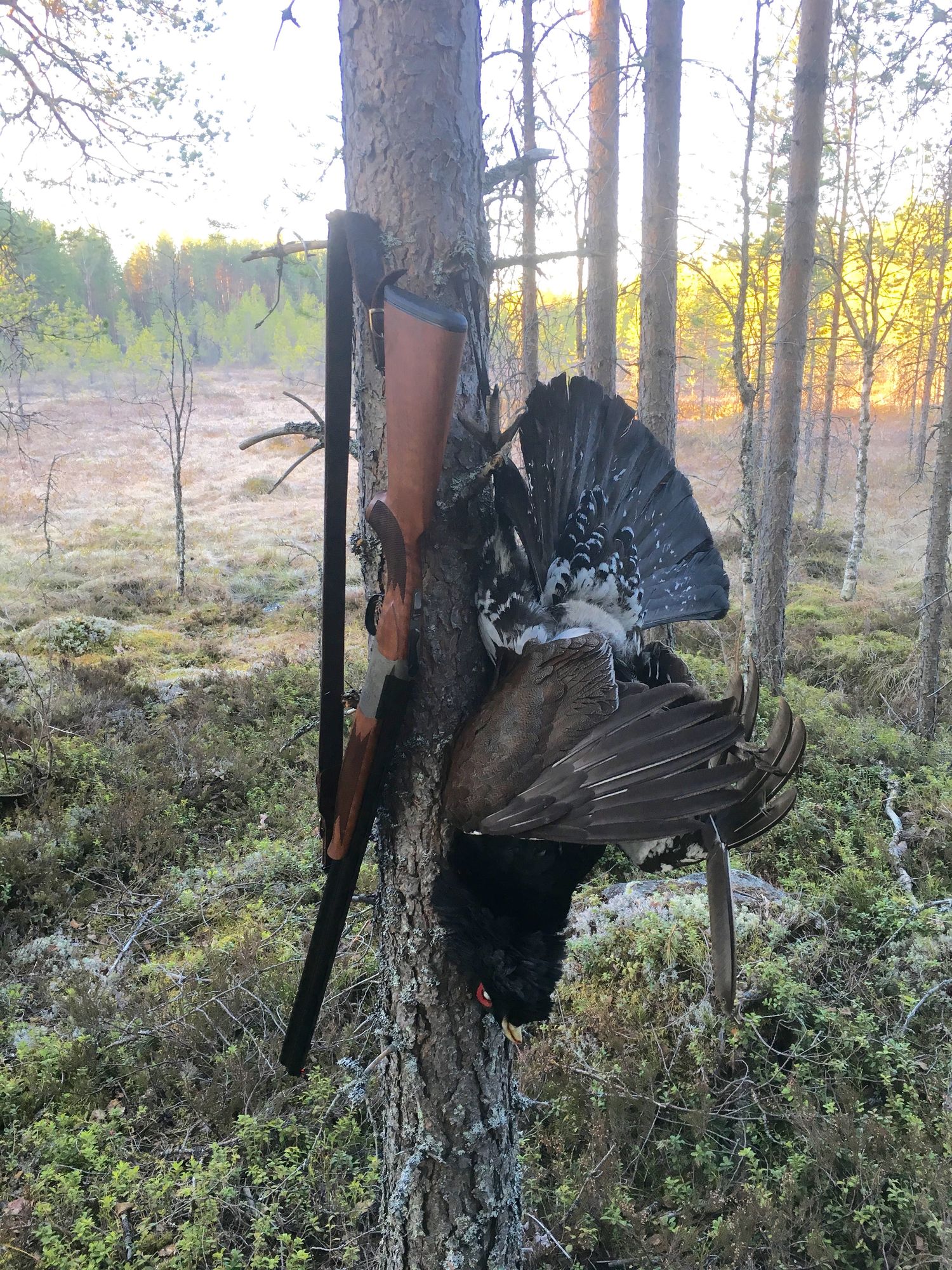 Вчера бумажульку закрыл. Подход не тяжелый, но очень долго ходил вокруг пяти сосен и высматривал. В какой то момент петух срывается и улетает, я плююсь и собираюсь возвращаться, но вдруг слышу песню. Оказывается он перелетел метров на 100 в сторону. Далее спокойный подход и выстрел. 4,6 кг.
