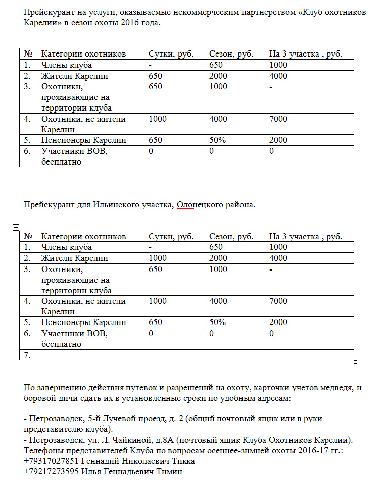 Прейскурант на услуги, оказываемые некоммерческим партнерством «Клуб охотников Карелии» в сезон охоты 2016 года.