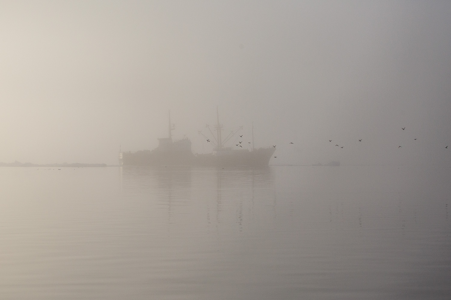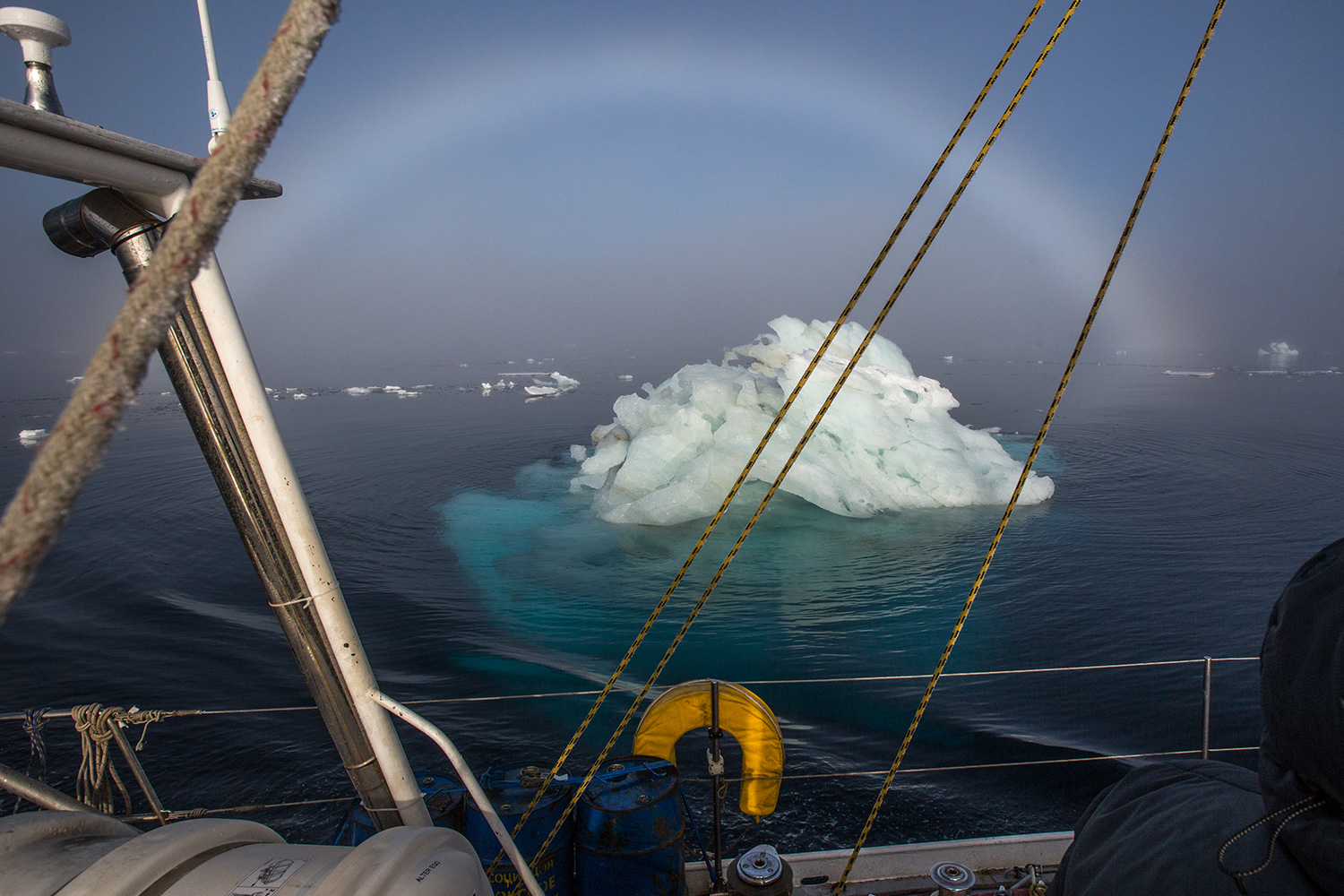 Редкая встреча среди северных полярных островов. Возвращаемся к яхте на лодке, раздвигая туман и льды, и вдруг резкий силуэт...