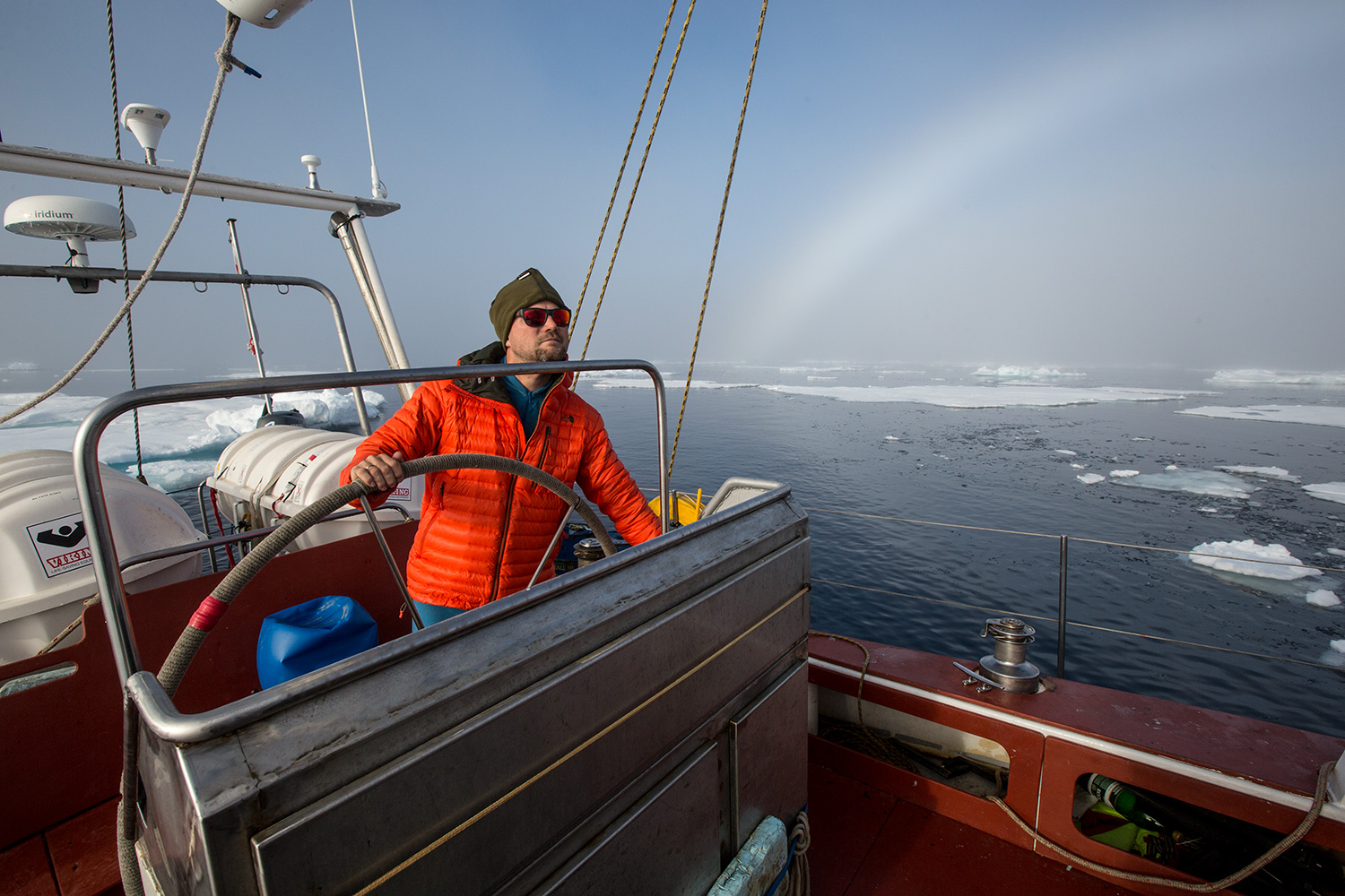 Чем дальше к исторической цели нашей экспедиции - тем глубже на север. Тем чаще встречаются ледяные заторы и перемычки в проливах островов Франца-Иосифа. Неведомым образом, наша вахта с Андреем Скоровым - чаще всех попадала в ледяной плен. В такой момент яхта начинает сильно скрежетать бортами о ледышки и малые айсберги. Все это эхом разносится по каютам. Всегда первым, а иногда и единственным, на палубу поднимается капитан Михаил Тигушкин и спасает ситуацию. Без опытного капитана-полярника во льдах Арктики делать нечего. Нам в этом плане сильно повезло, а иногда нас спасало.