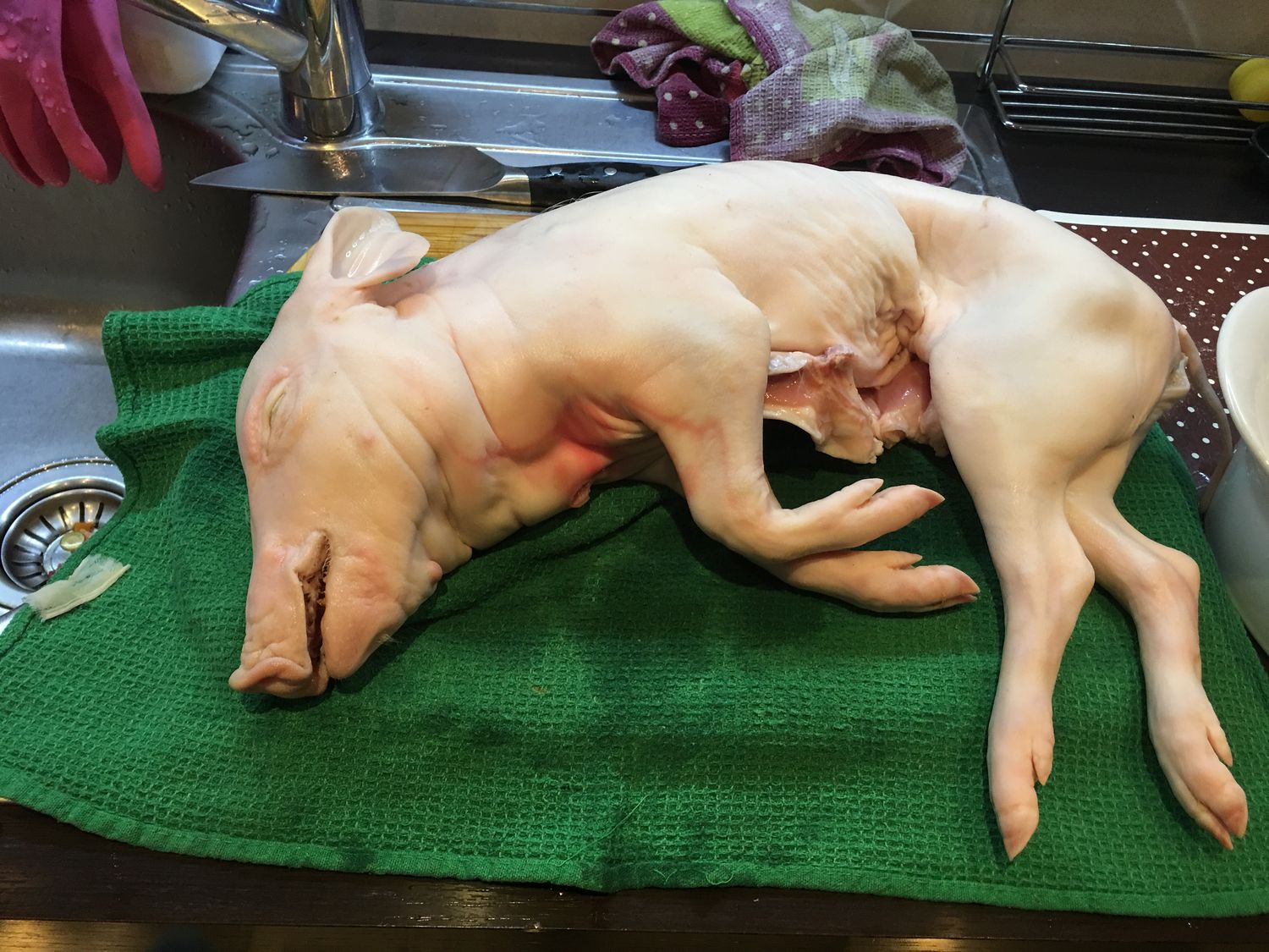 Пороса промываем, чистим. Изнутри по позвоночнику и ребрышкам натираем чесноком. Вдоль позвоночника делаем надрезы с двух сторон. Главное не прорезать поросенка насквозь! Это делается, чтобы маринад лучше проник в мясо.