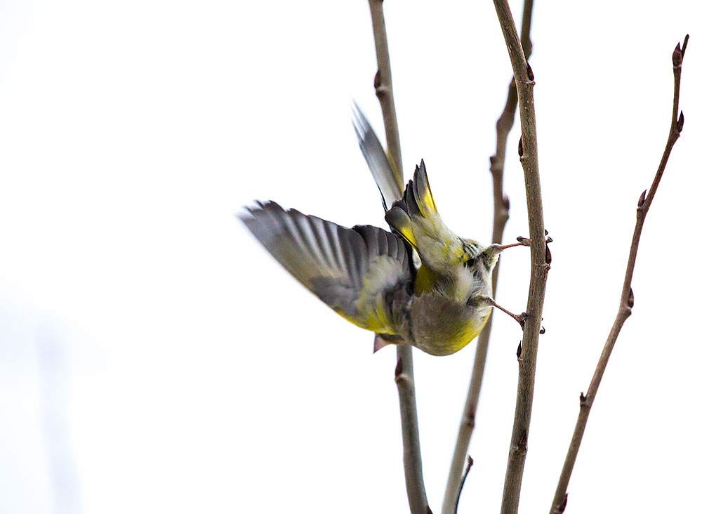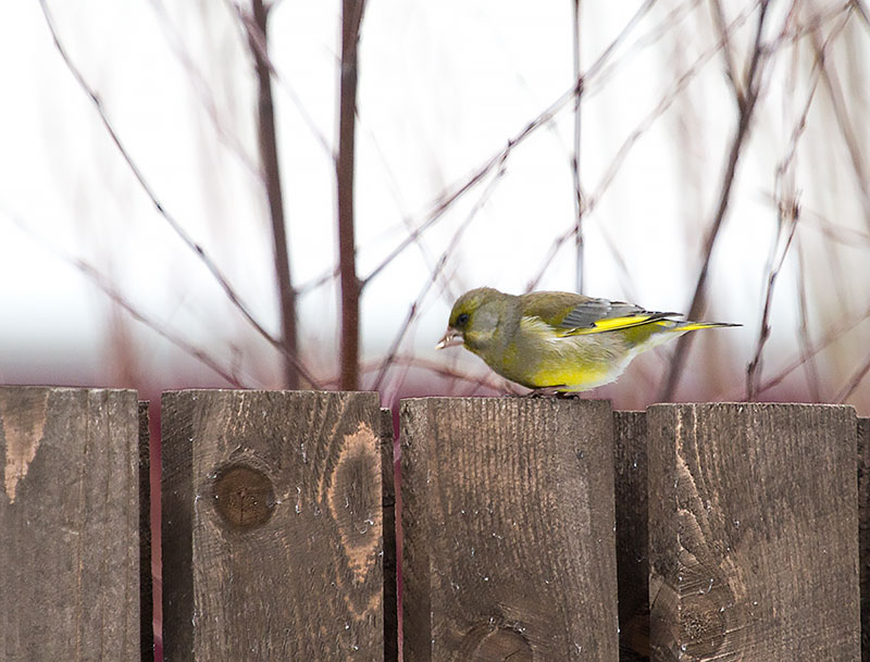 Зеленушка (Chloris chloris) European greenfinch (eng.)Птица размером с воробья с толстым клювом. Верх тела зеленовато-серый. Надхвостье и брюхо желтовато-зеленые. Крылья серые, с полоской (хорошо заметно в полете).