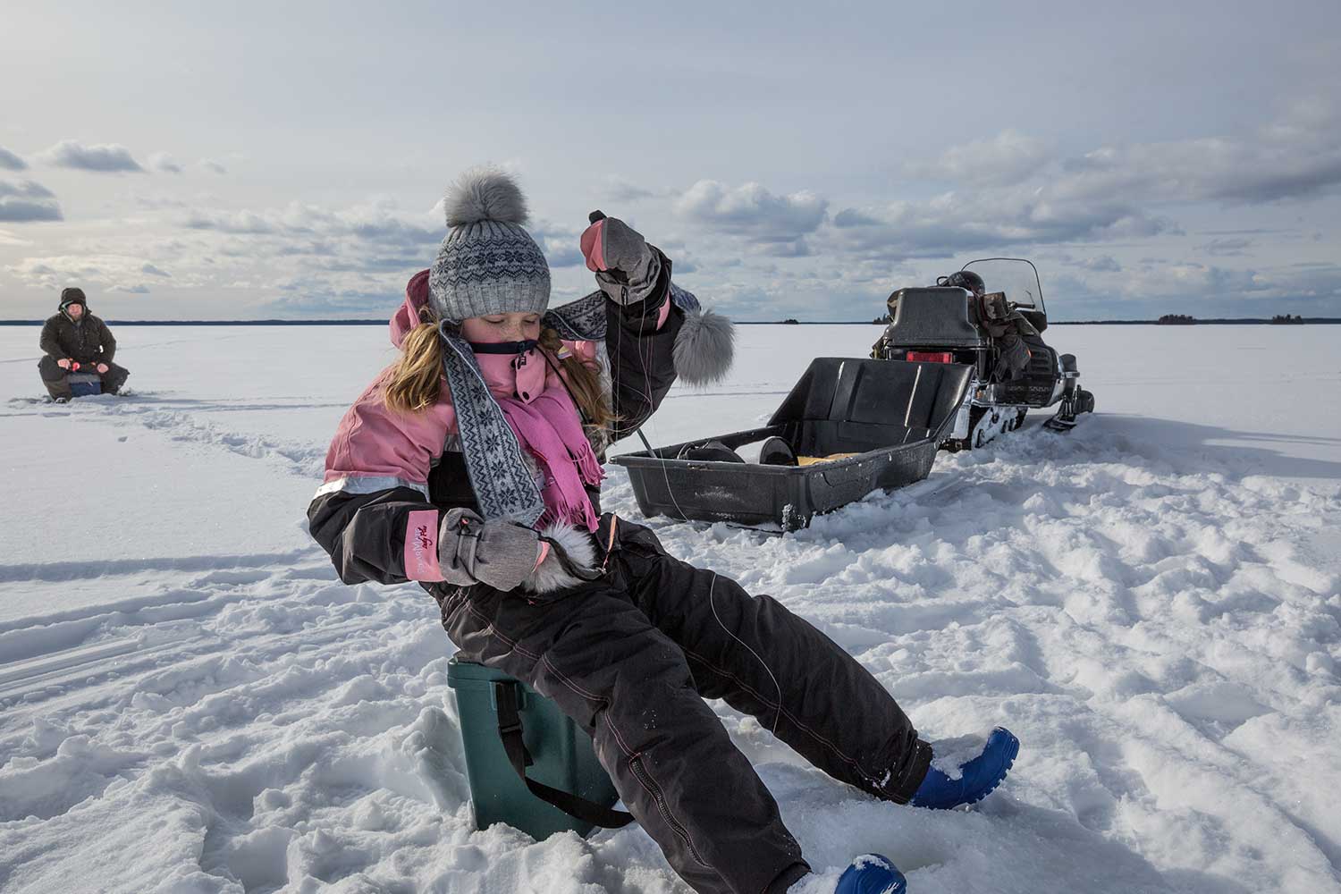 В результате - один налим на 2 кг. Один на 3 кг. И несколько мелких. Снятием жерлиц занималась младшая дочка, о чем в будущем будет видеосюжет - без курьезов не обошлось. То налим выплюнет рыбу и в лунку обратно уползет, то крупного не вытянуть и т.д.