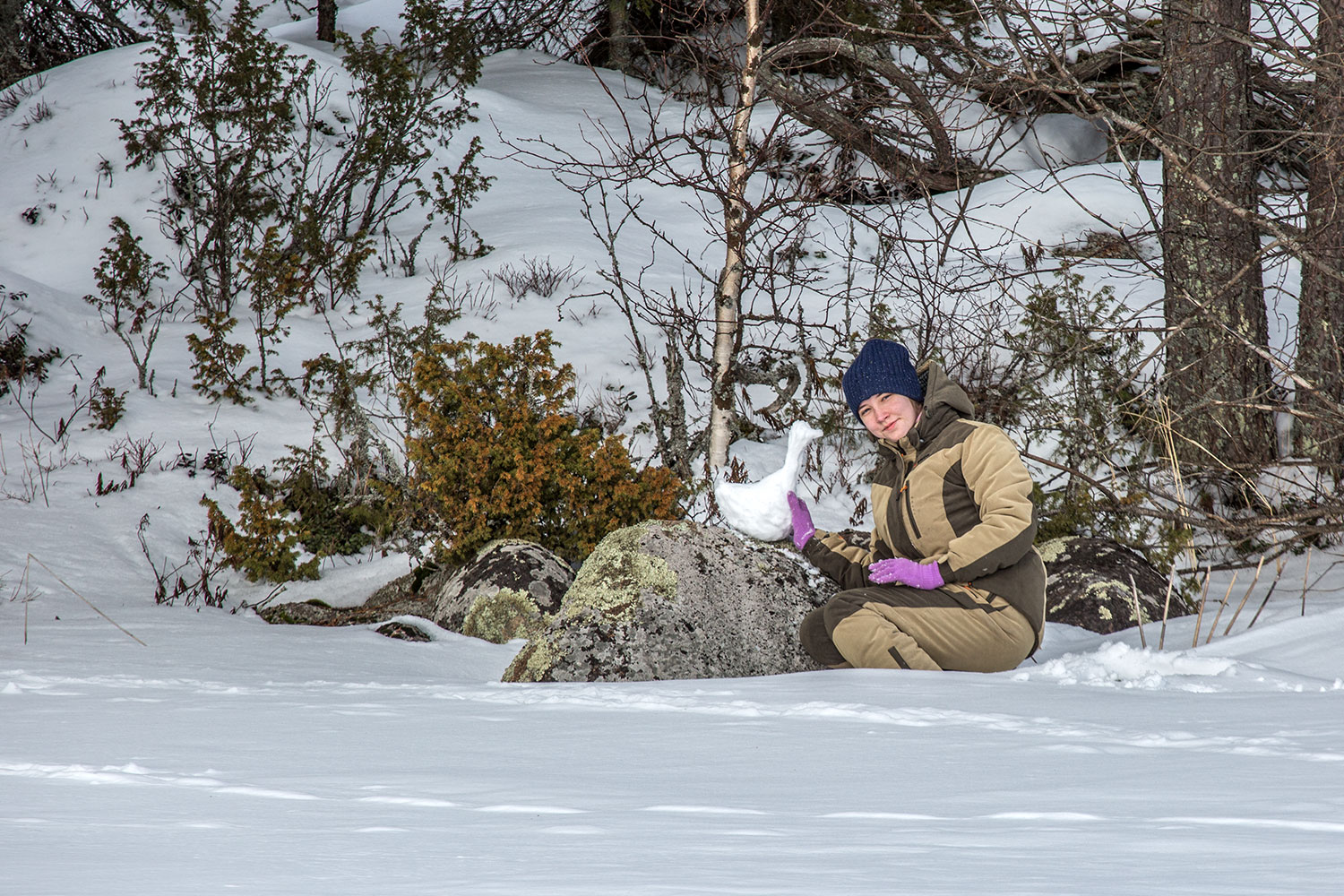 Пока мы налимов ловили - "загорающие" поймали два десятка окуней вполне приличного размера - в самый раз на уху. Но клев был никудышный. Яркое солнце сделало свое дело - рыбка спряталась. Зато снег липкий - кто-то снеговика лепил, кто лебедей... До обеда не дотянули - поехали ближе к городу.