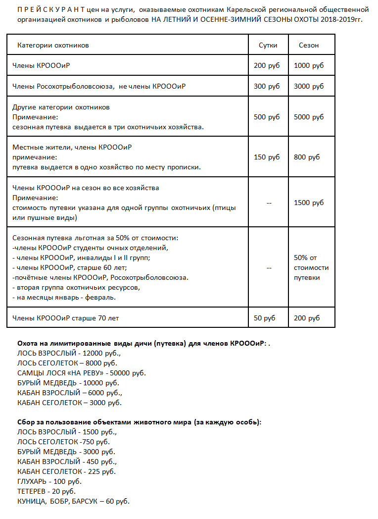 П Р Е Й С К У Р А Н Т цен на услуги, оказываемые охотникам Карельской региональной общественной организацией охотников и рыболовов НА ЛЕТНИЙ И ОСЕННЕ-ЗИМНИЙ СЕЗОНЫ ОХОТЫ 2018-2019гг.