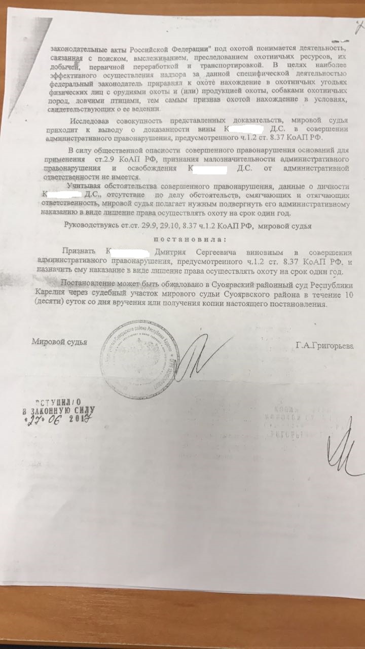Да там юридически куча промахов, достаточно " находясь на лесной дороге" - это дорога общего пользования идущая к границе с Финляндией и самое крутое " ...с зачехлённым снаряженным непристегнутым магазином карабином..."Reanimatolog писал(а):Я бы обжаловал такое решение. Начав с того, что не указаны координаты "правонарушения".