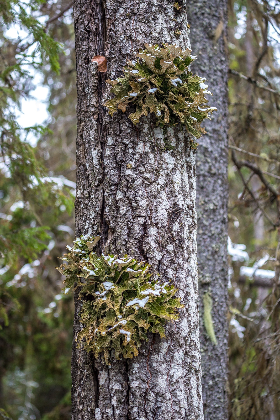 Лобария лёгочная или Лобария пульмонария (лат. Lobaria pulmonaria). Чудом уцелела, хотя зажата между двумя вырубками.