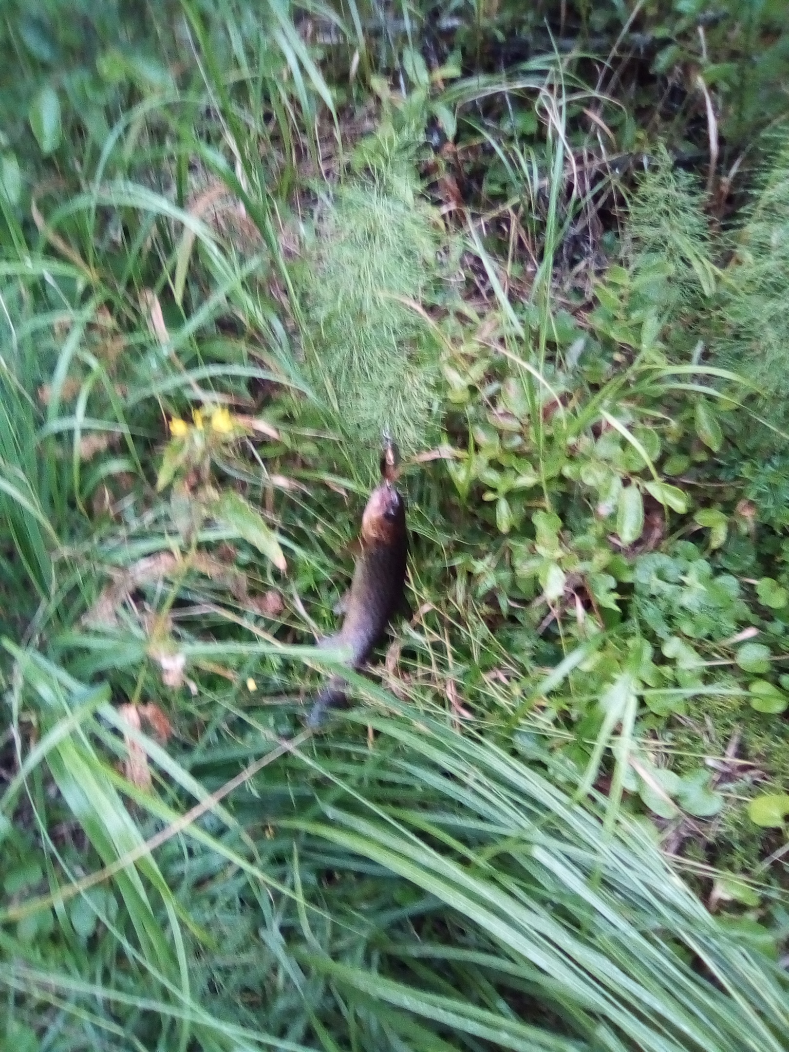 Мы ловили исключительно на вертушки. Потому как воблерочки просто некуда закинуть, вертушку и то с трудом куда можно запустить. Ну а по рыбалке мы с товарищем, в целом, вылазкой довольны. Жаль, конечно, что не удалось побороться с достойной ручьевой пеструшкой. Но все таки по рыбешке поймали- уже не ноль, прогулялись по красавице речке, размялись, заправились чистейшим воздухом. А много ли нам надо? На воде были, приманки макали, рыбка видели - рыбалка удалась