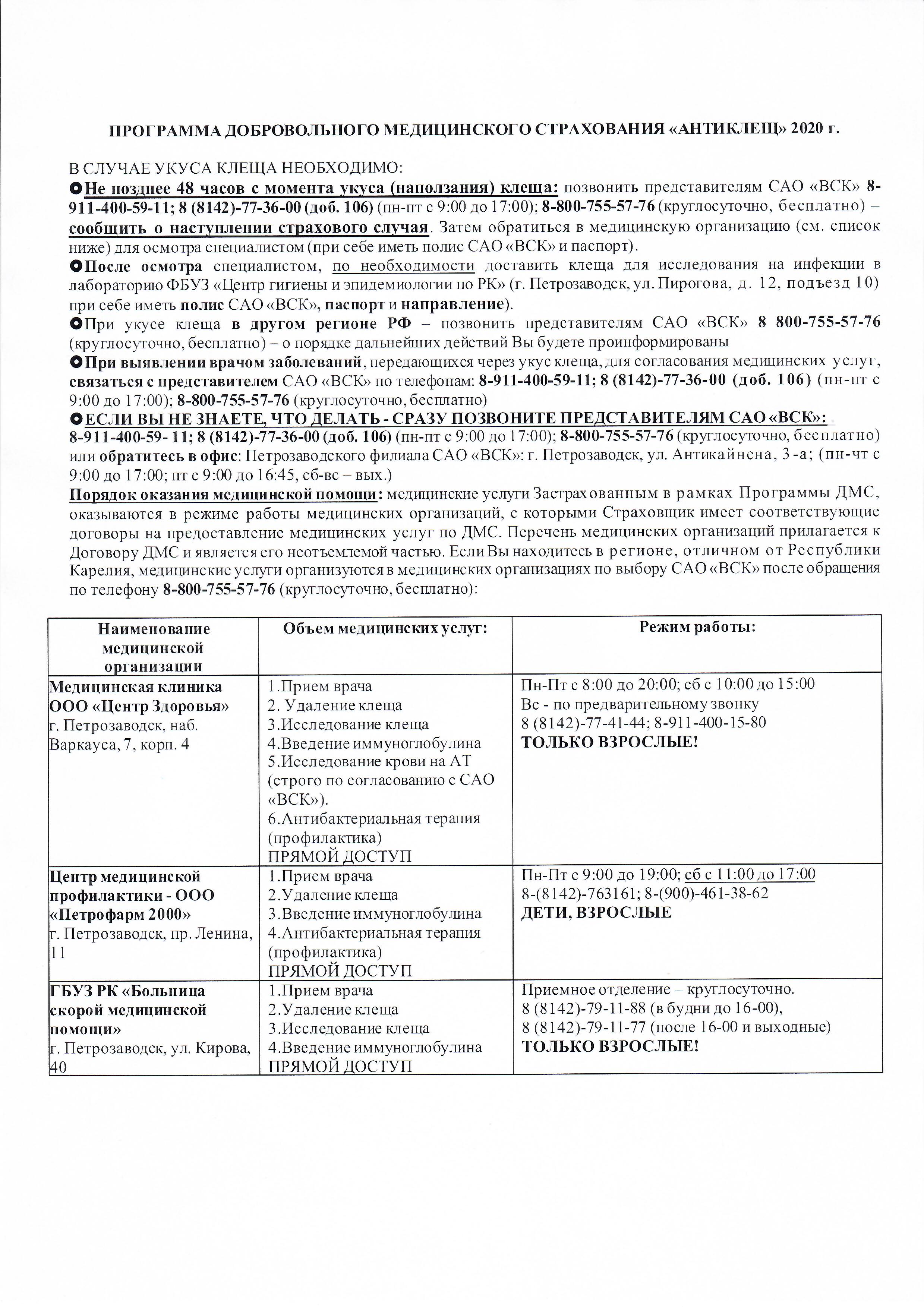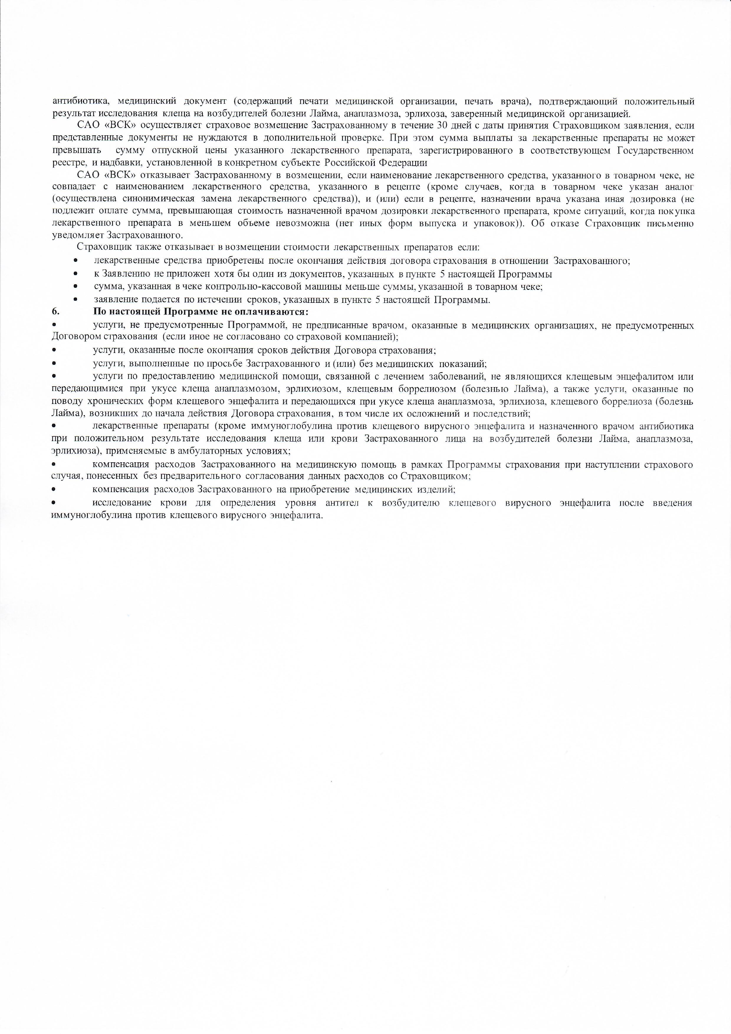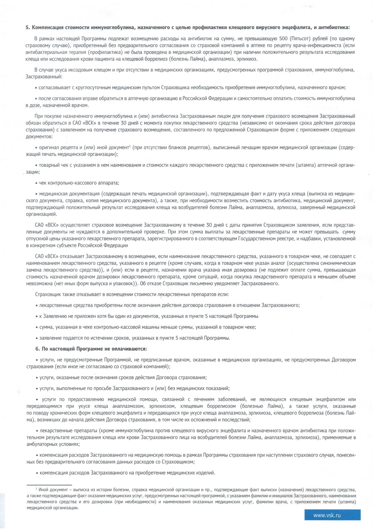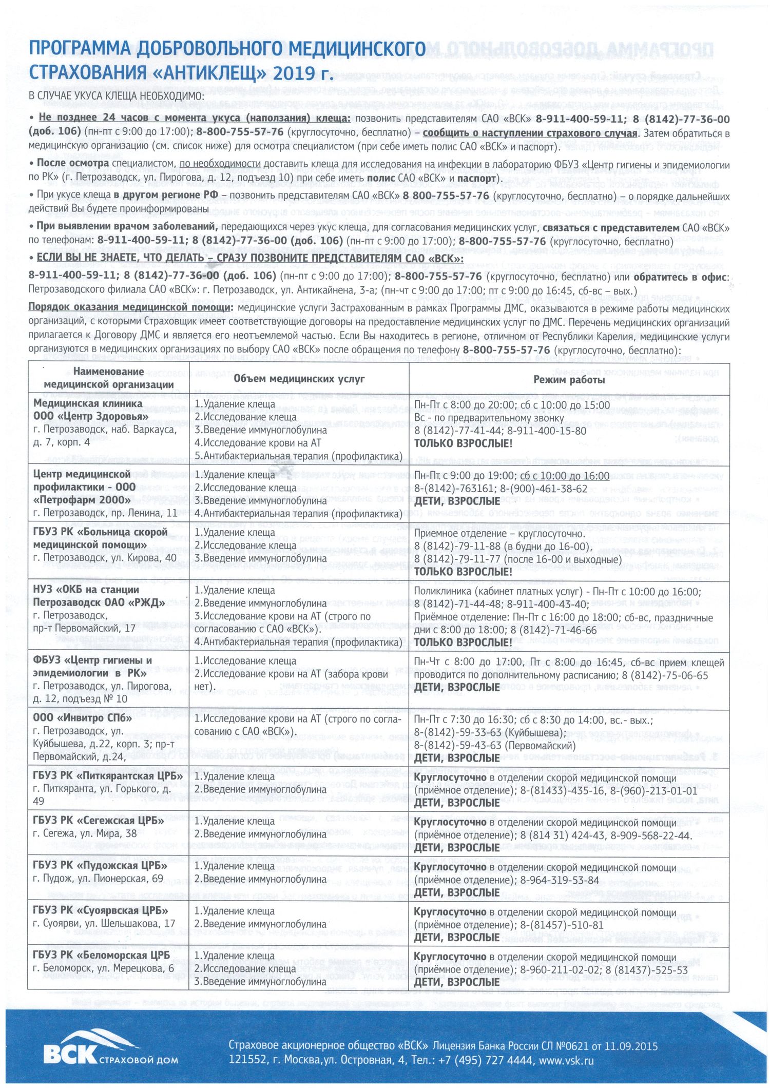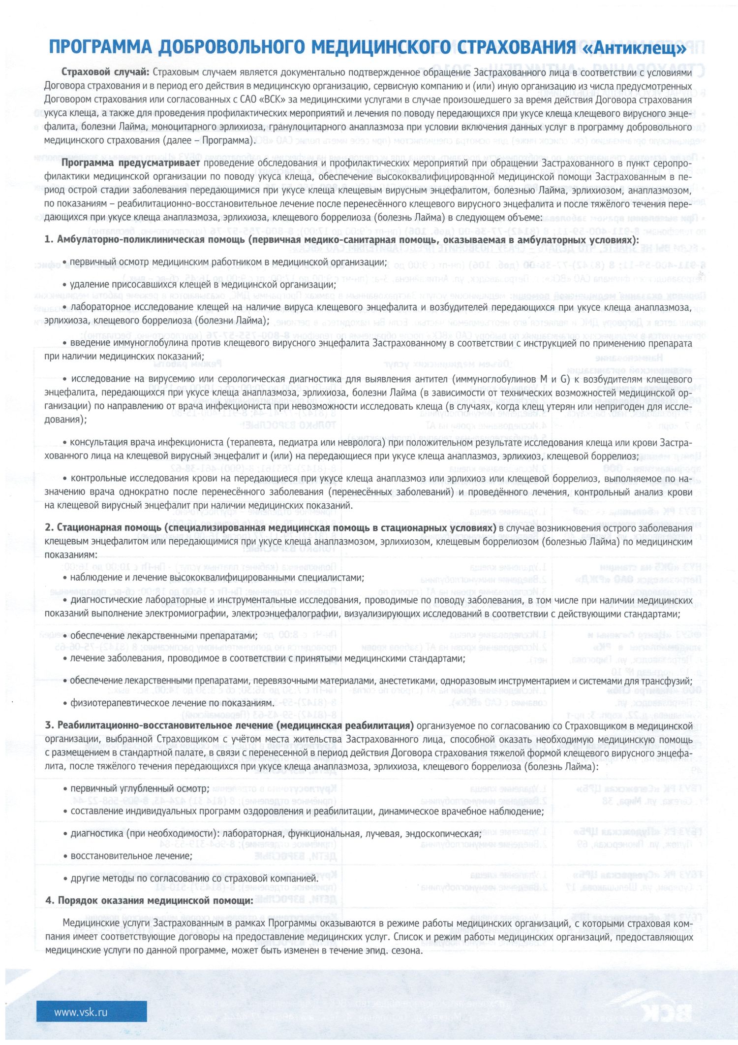 СК "ВСК" предлагает страховой полис от укуса клеща. Стоимость полиса на год-200 рублей (для взрослых и детей). Проверка на 4 болезни, передаваемых клещом: энцефалит, боррелиоз (болезнь Лайма), эрлихиоз, анаплазмоз. Компенсация антибиотиков 500 руб., выписанных врачом (боррелиоз). С этого года вводится новшество-выдача направления, которое будет выдаваться с полисом.