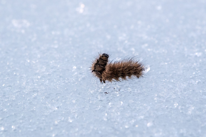 Гусеница бабочки-медведицы вышла половить рыбу на лед озера в Пряжинском районе Карелии.