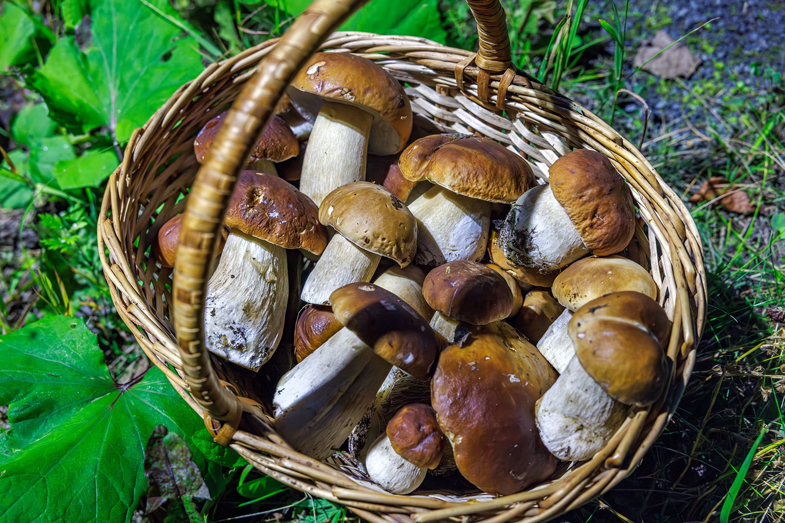 Собраны парочка корзинок грибов и несколько кружек ягод.