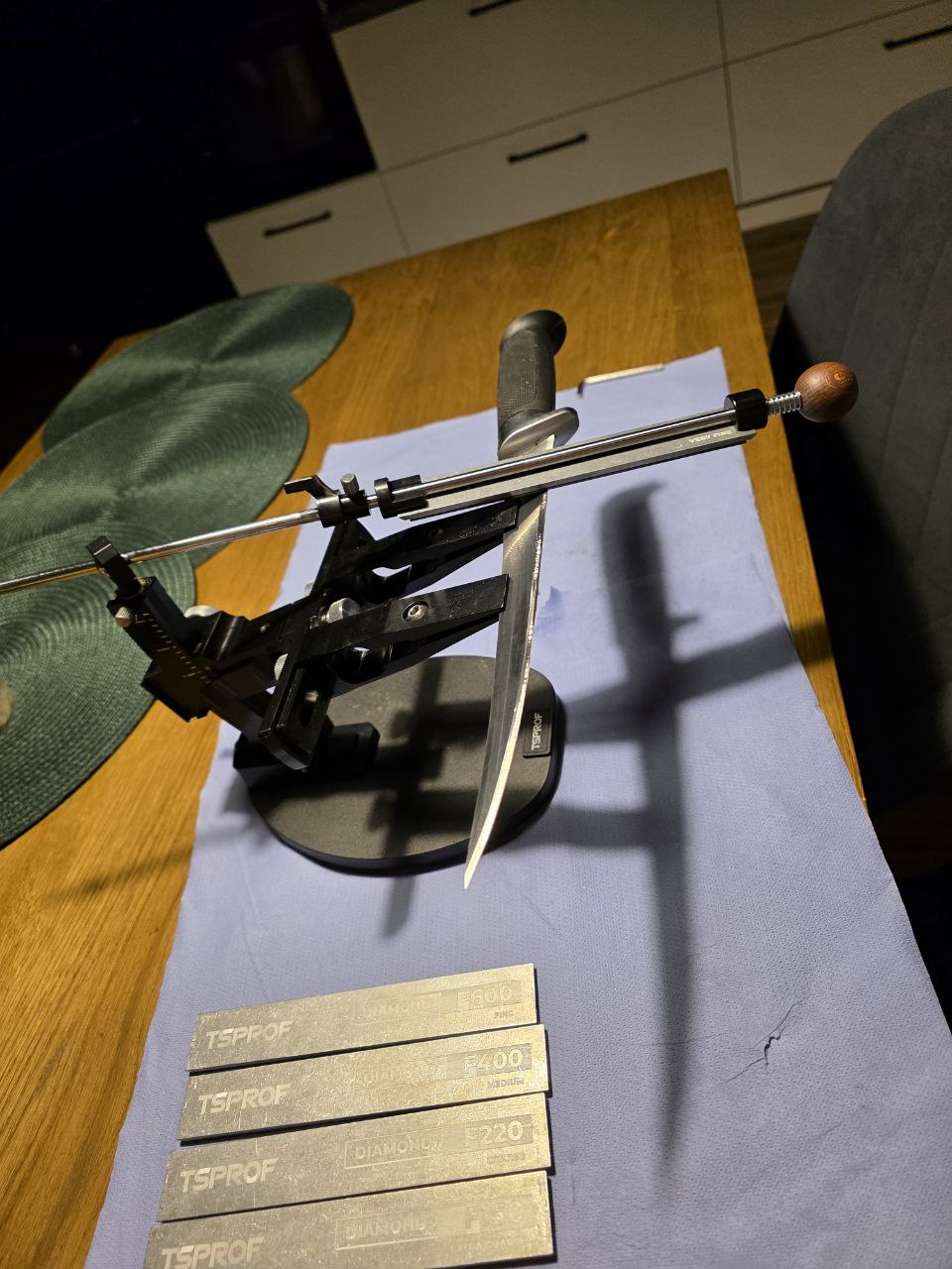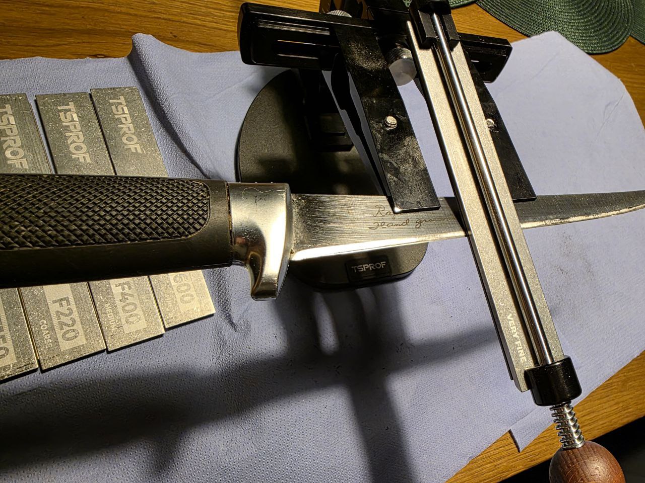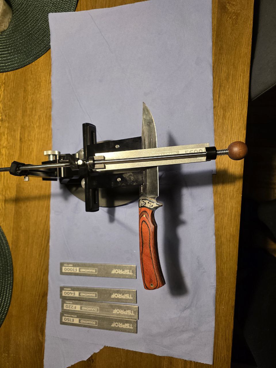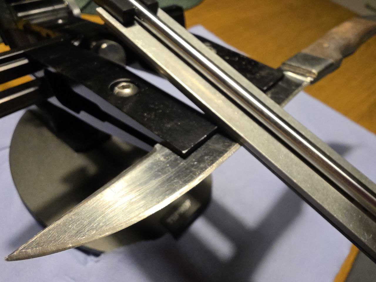 Поточил ножи в субботу. Дольше всего провозился с филейным, хотя и не убитый был-как ни странно самая широкая кромка у него. Кухонные ножи вообще 3 минуты делов, одним бруском 600-м. Немножко телефонофото.