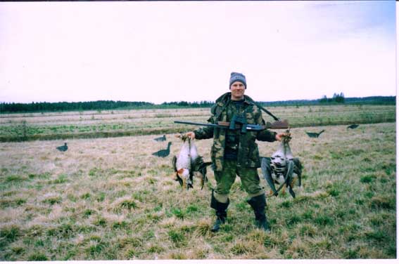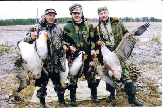 Весной 2008 года охотился на Виданских полях, народу было - тьма. Я сделал скрадок под самым лесом, подальше от всех. Еще были сумерки , что то около 4 часов, когда на фоне леса, едва заметные, молча пролетели два силуэта, я даже подумал что это журавли. Ближе к 7 утра, уже было сбито несколько гусей, также молча и внезапно на высоте 20 метров налетели эти гиганты, я буквально разрядил в них Мурку. На фотке я с сыновьями, на фоне этих гусей серые гуси кажутся кряквами. Как выяснилось, это канадские казарки, вес около 9 кг, которые у нас в Красной книге, а в Канаде - основной объект охоты. К нам залетают очень редко. Белощекая казарка похоже на неё, но она намного меньше, их много на белом море. Из одного я сделал "медальон" по грудь, теперь любуюсь, а из другого известный таксидермист Василий Иванович сделал чучело, и если кто был у нас в городе на охотничьей выставке, наверняка обратил на этого гуся внимание. Вот такая история. Меня пытались осуждать за подбитые редкие виды, но покажите мне того кто не стал бы стрелять в налетевших гусей, на них бирок нет :-.-.-.
