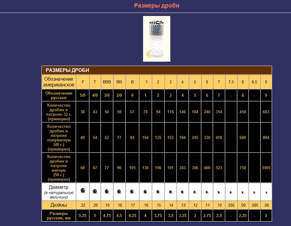Диаметр дроби разных номеров.