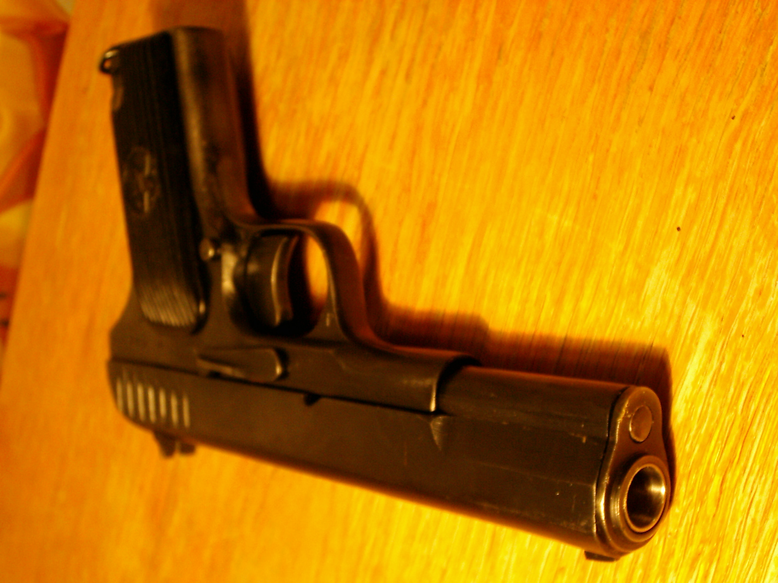 Куплен в конце 2007 года. Год выпуска 1943, возможно побывал на войне. Покупался не как оружие самообороны а скорее из-за уважения к пистолету ТТ. В плане надежности - далеко не самый лучший пистолет, часты перекосы патрона, примерно 1 перекос на 10 выстрелов. Объясняется это в основном некачественными патронами. Для сравнения патроны одной партии из 7 выстрелов дали 3! перекоса, потом стреляя патронами из другой партии все 7 выстрелов без задержек. Т.к. у этого пистолета нет ствола, а только его иммитатор, то разлет очень приличный, с 5 метров отклонение от точки причеливания достигает 15-20 см. По бутылкам толком не постреляешь. Да и патроны стоят прилично, 70 руб. штука это в Дерри, в Военохоте 45 р. В Москве 35 р.