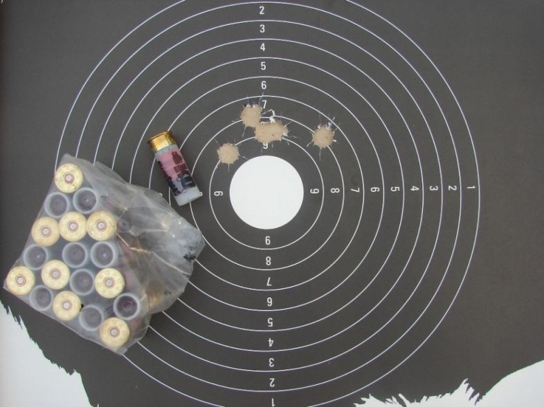 Вариант 4. 5 выстрелов практически повторили предыдущий вариант - в пределах 9 см, пробоины идеальные. Выстрел резкий, отдача нормальная, но чуть пожестче варианта3. Ствол чистый.