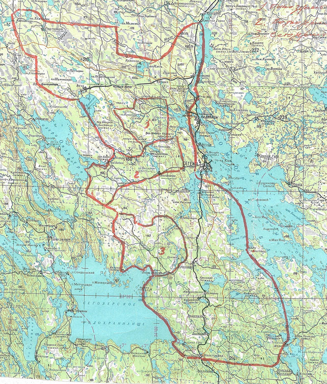 с востока: от границы с Беломорским районом по фарватеру ББК до границы с Медвежьегорским районом, исключая зеленые зоны г. Сегежа, п. Надвоицы и остров Сиговец;