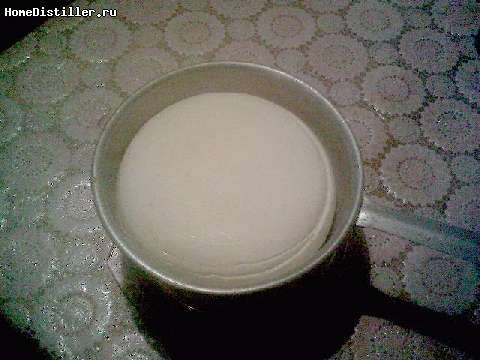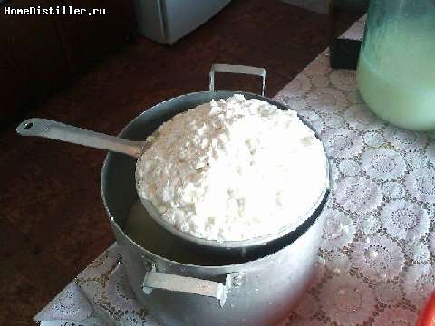3. Примерно ещё через пол часа частицы сгустка (их называют зерно) уплотнятся и можно будет осторожно помешивать они разобьются на ещё мелкие части, надо старатся чтобы совсем маленьких зёрен не было.