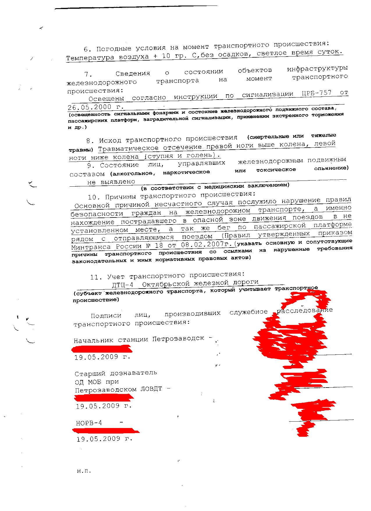 В общем так. У меня на руках копия Акта №2 от 19.05.2009 служебного расследования транспортного проишествия, повлекшего причинение вреда жизни или здоровью граждан, не связанных с производством на железнодорожном транспорте.