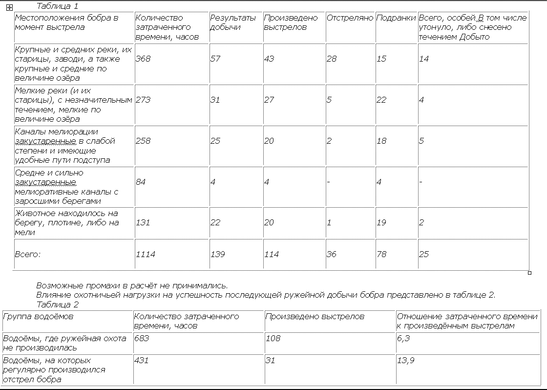Полученные в результате анонимного опроса сведения настолько объёмные и разносторонние, что уместить их в одной статье не представляется возможным. В связи, с чем представлю только основные выявленные закономерности ружейной охоты на бобра. Так в таблице 1 представлена зависимость добычливости и нерациональных потерь от местоположения бобра в момент выстрела.