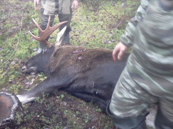 в выходные совершили очередную вылазку в поисках крупного,рогатого животного ,после проведения двух загонов были обнаружены свежие следы(свежие значит совсем),приняли решение повторить второй загон еще раз только шире,при выдвижении загонщиков лось был обнаружен на делянке на расстоянии 135м (замер по навигатору после отстрела),стреляли из вепрь супер 308(два попадания) и иж 58-12(одно),зверь остался битым на месте