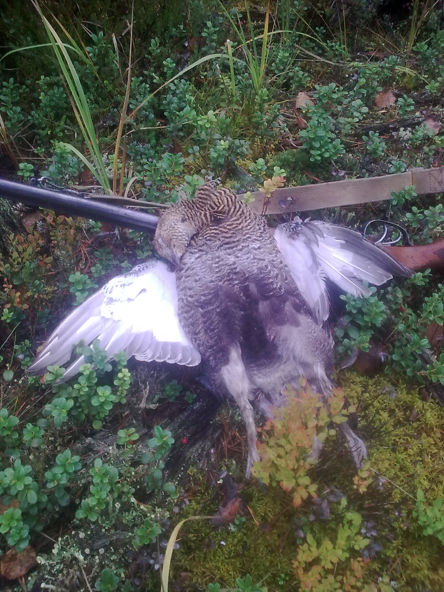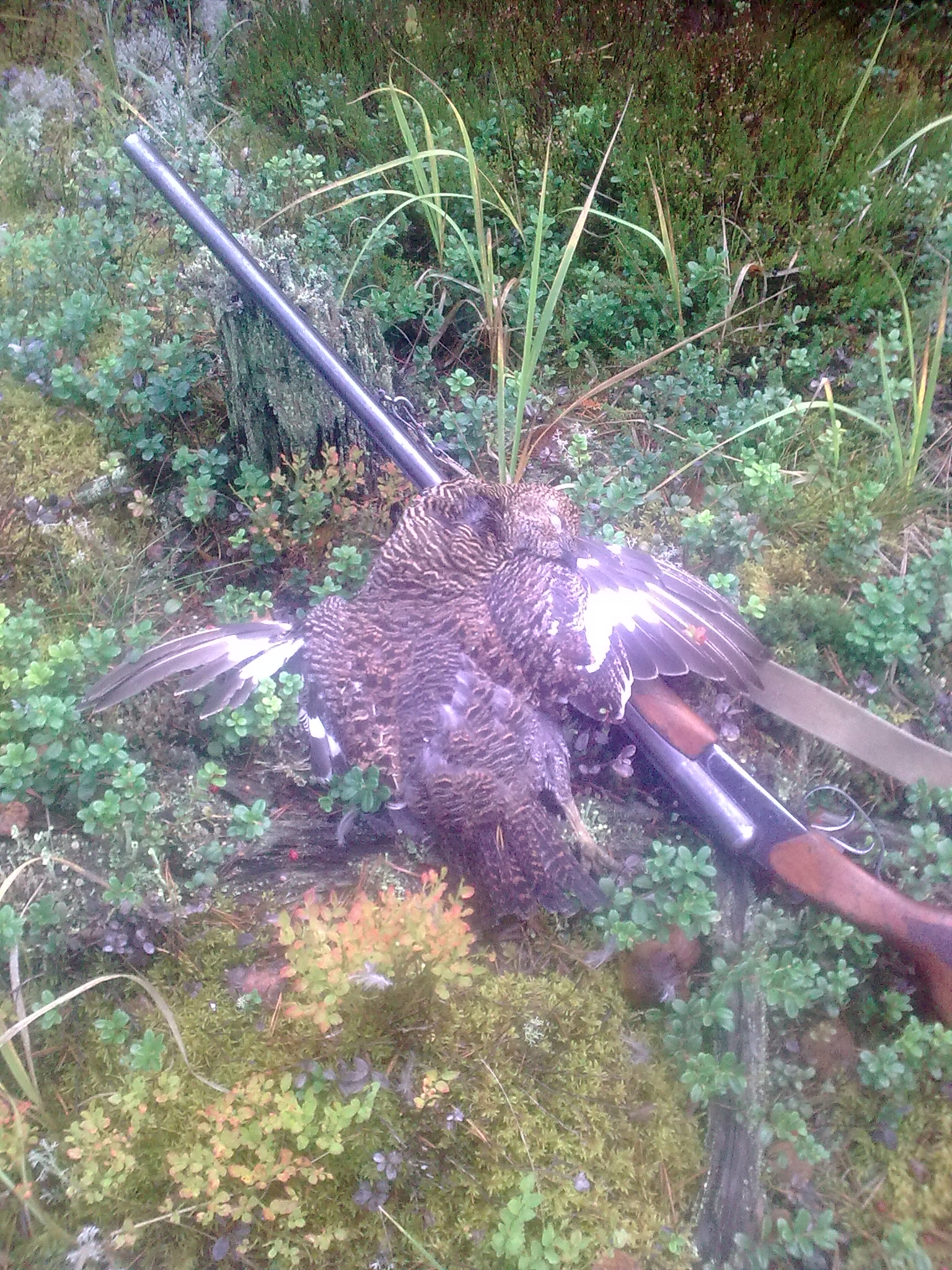 Кстати, не убиваите сильно ...! вроде тетерка..., С ягоды поднялась.....за брусникой шел.( в сентябре)..Думать было некогда , стрелял по силуету..думал рябой