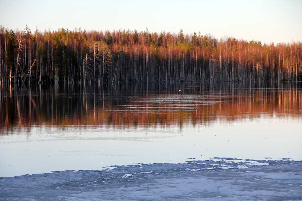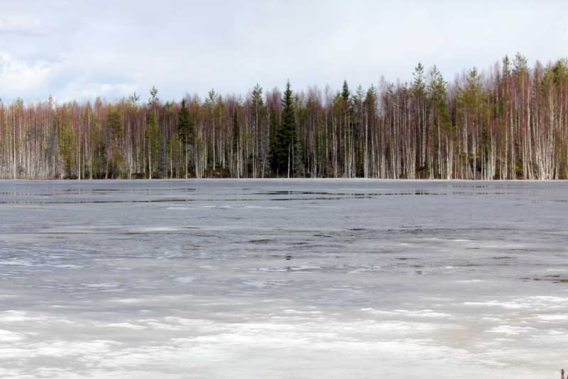 Через три километра повстречали УАЗку, которая шла навстречу со словами: «Не проехать!» Но так как вечерело, решили до ближайшей сопочки без снега пробиться и там принять решение о нашей судьбе. С горем пополам пробились к одной из ламбушек. Лед 20 см. На берегу сугробы по колено. Только на дороге оттаявший пяточек карельской землицы. Попробовали ехать дальше, но застряли в низине в сугробах по самые лобовые стекла и вернулись к ламбе. Разбили придорожный бивак на обочине.