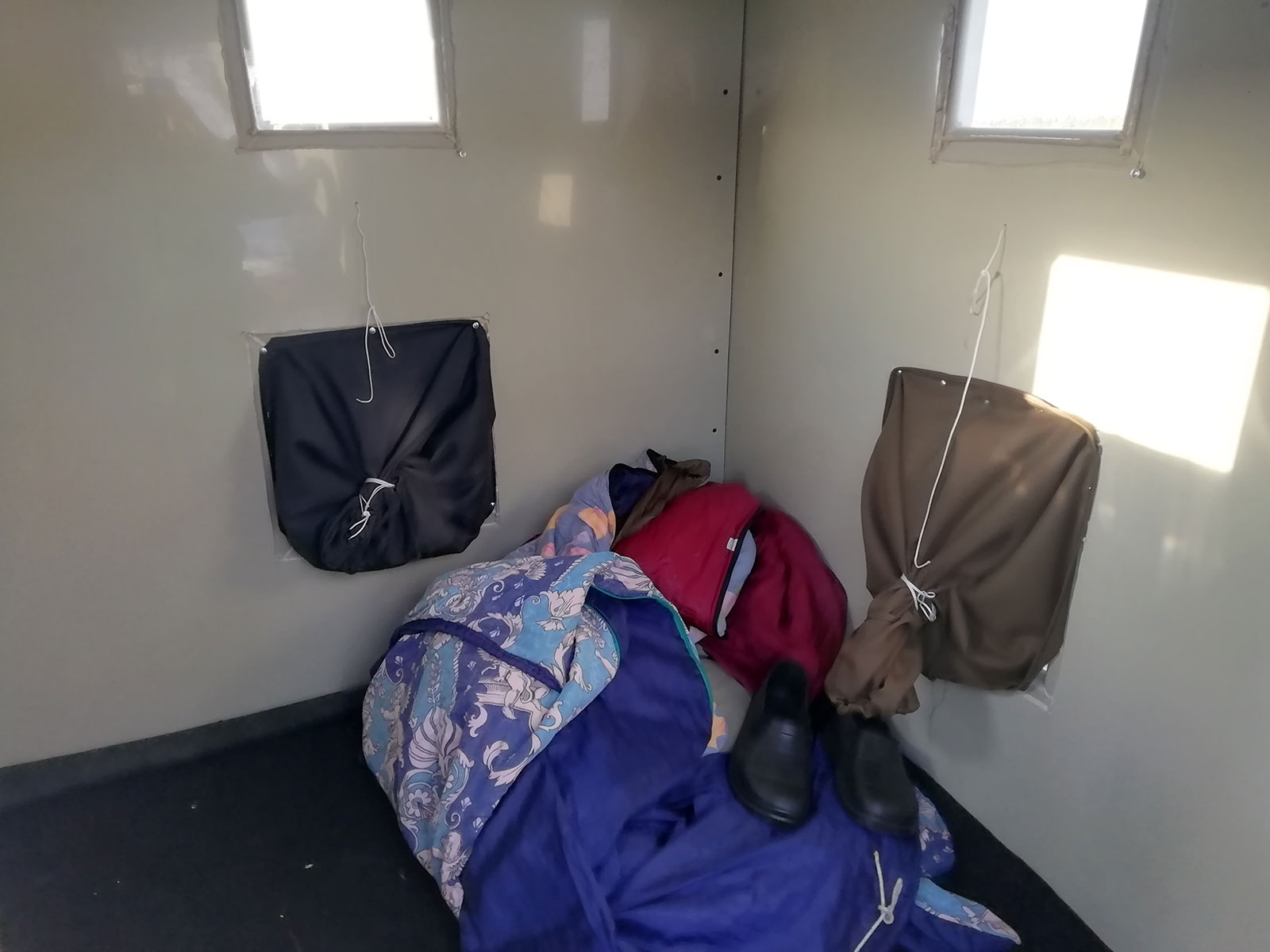 Как и ожидалось, весеннее солнышко подтопило снег, и домики накренились на южную сторону. Пришлось применить смекалку, сноровку и немного грубой силы - домики выровняли. Затем закрепили тряпичные фоторукава на фотоокна, постелили на дно домиков новый ковролин, сделали внутри крючки для одежды и приготовились к ночлегу.