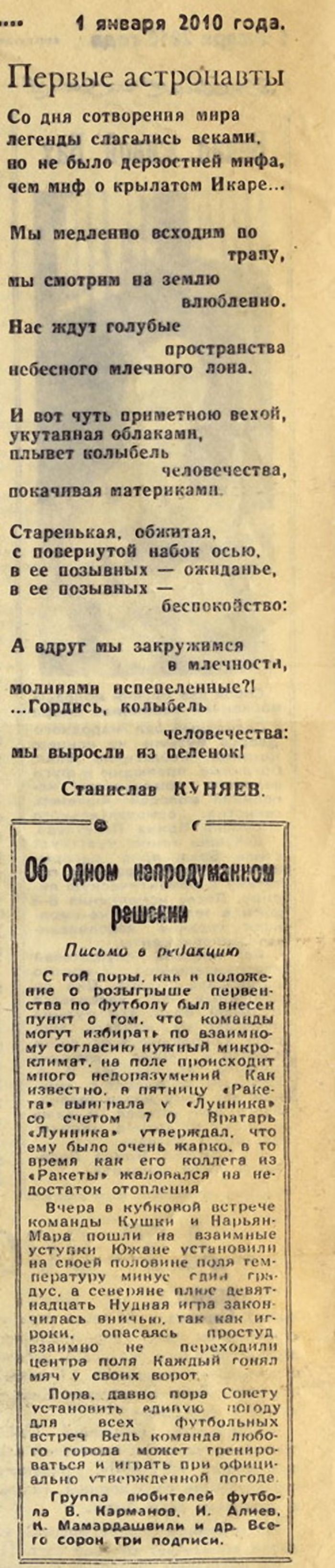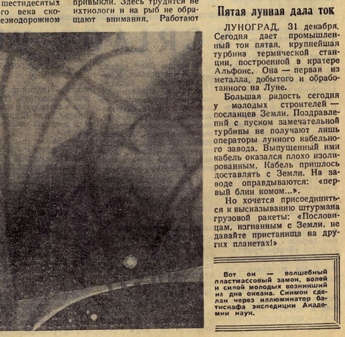 Полвека назад, в канун 1960 года, советскому человеку выпала редкая возможность прочитать газету из далекого будущего, датированную 1 января 2010 года. Такой новогодний подарок придумала для своих читателей "Комсомольская правда". На двух разворотах журналисты представили мир таким, каким он будет, по их мнению, 50 лет спустя…